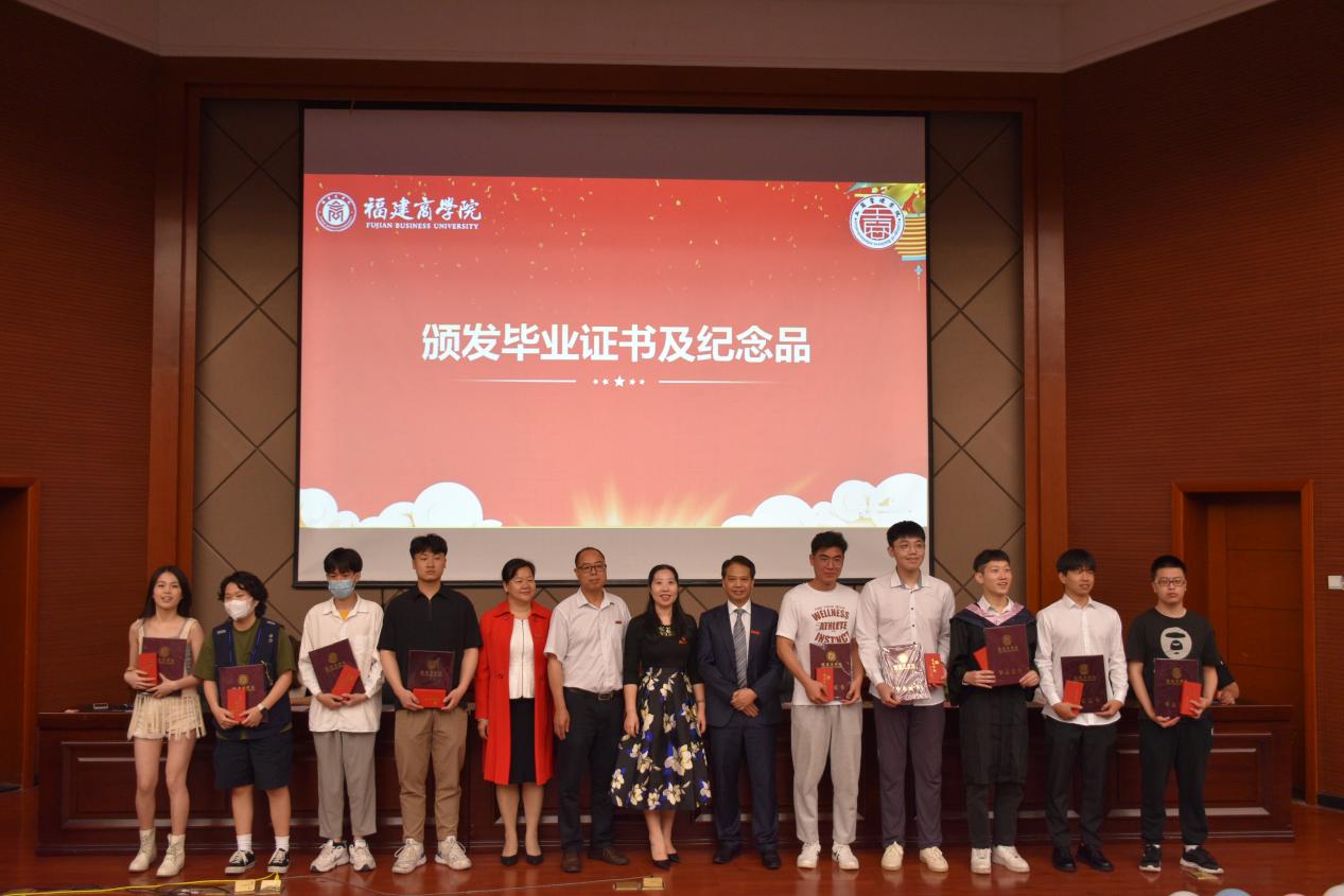 纪孝清副院长等学院领导为毕业生颁发毕业证书和毕业纪念品,并与毕业生合照留念。