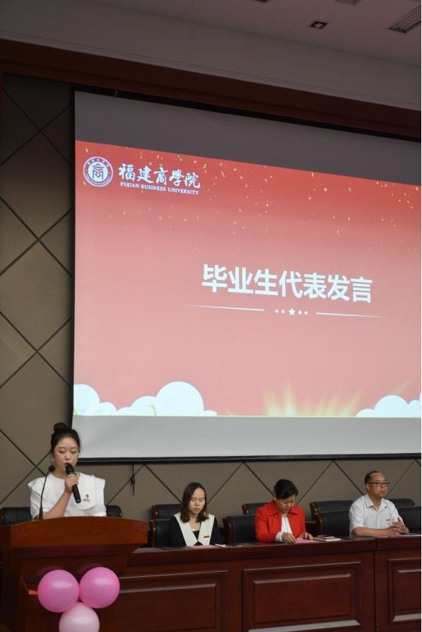 周晴晴和梁诗琪分别代表2022届本、专科毕业生上台发言。她们郑重承诺,要践行 “诚信、明德、允能、笃行”的校训,以百年闽商精神,共筑繁盛国家。