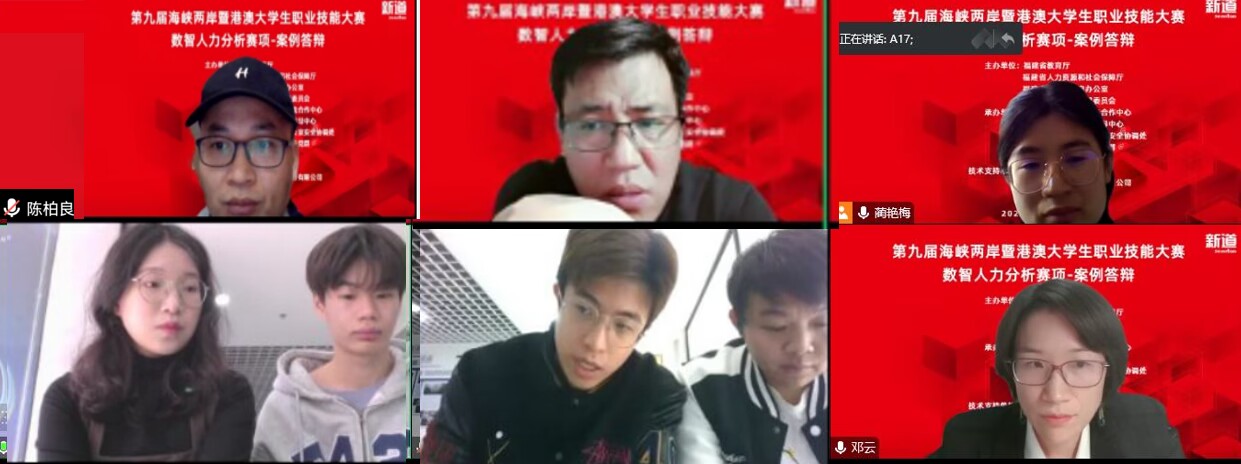 2022年11月5日,第九届海峡两岸暨港澳大学生职业技能大赛数智人力分析赛项通过腾讯会议进行线上案例答辩比赛。受疫情影响,我校世界杯体育官方网站教师陈柏良、邓云通过腾讯会议线上接入担任数智人力分析赛项专家评委。