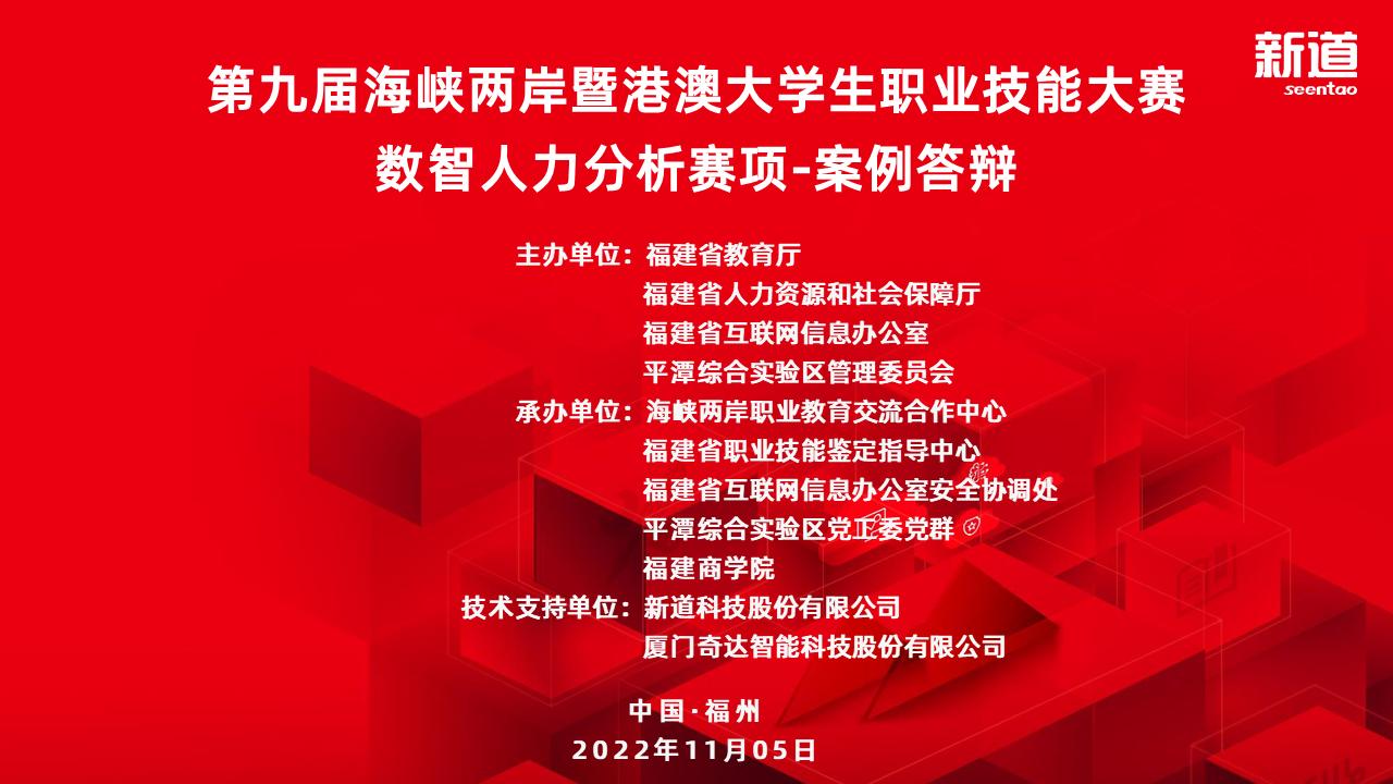 第九届海峡两岸暨港澳大学生职业技能大赛数智人力分析赛项由福建省教育厅、福建省人力资源和社会保障厅、福建省互联网信息办公室、平潭综合实验区管理委员会主办,世界杯体育官方网站人力资源管理专业参与承办,新道科技股份有限公司及厦门齐达智能科技股份有限公司提供技术支持。
