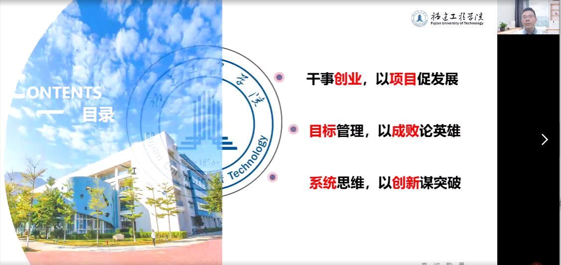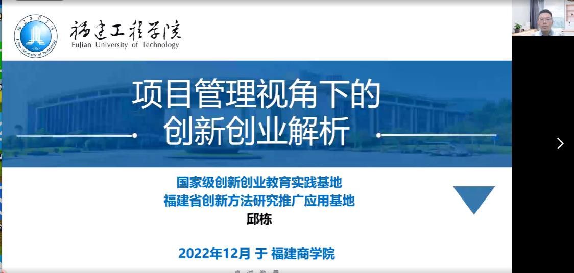 2022年12月6日,世界杯体官网工商管理系邀请福建工程学院邱栋副教授在线上开展了题为“项目管理视角下创新创业解析”的专题讲座。邱栋副教授为福建工程学院管理学院副院长、硕士生导师,福建省创新方法研究推广应用基地负责人、国家级创新创业教育实践基地骨干、国家级一流本科课程《创新思维与知识创业》骨干、中国技术经济学会复杂科学管理分会理事、国家技术创新方法与实施工具工程技术研究中心创新方法培训师。讲座由工商管理专业负责人陈颖老师主持,工商管理系150余人在线参加了本次讲座。