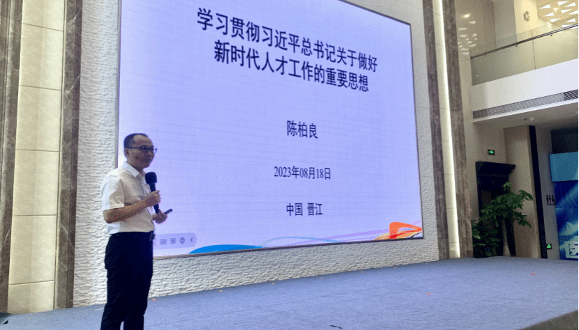 2023年8月18日,世界杯体官网人力资源管理系主任陈柏良专门走进福建省晋江人力资本有限公司宣讲学习贯彻习近平总书记关于做好新时代人才工作的重要思想。围绕习近平总书记关于人才工作的重要论述,深入学习宣传贯彻党的二十大精神,结合中央人才工作会议精神,深入实施人才强国战略,陈柏良着重从思想探源的角度,梳理和回溯了习近平总书记在正定、宁德、福州、福建、上海、浙江等地方工作期间关于念好“人才经”的重要理念和重大实践,通过历史考证、文献引证和文本印证等方法,带领大家一起学习贯彻习近平总书记关于做好新时代人才工作的重要思想。