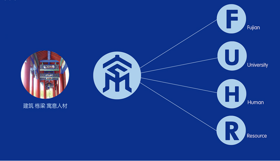 福商HR专业公共品牌LOGO中隐含的图文F、U、H、R、M分别人代表Fujian(福建)、University(大学)、Human(人力)、Resource(资源),Managemengt(管理),福商HR专业公共品牌LOGO设计以古代建筑的构型为载体,意涵栋梁、人才(人材),寓涵福商HR专业致力于培养堪担重任的新时代栋梁人才。