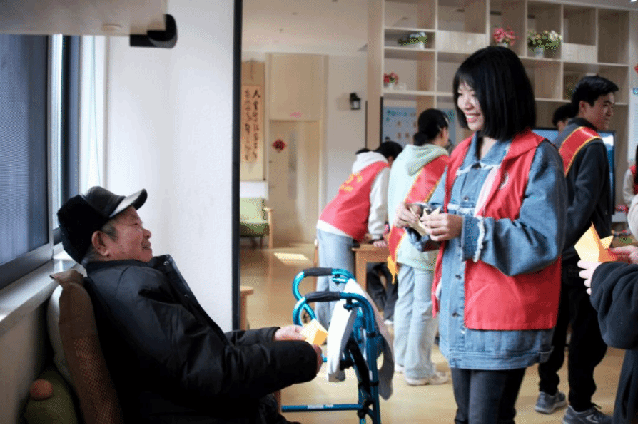 接下来紧跟志愿者们的脚步,一起看看温暖瞬间。志愿者一对一折纸教学,爷爷奶奶们跃跃欲试的手。颜色各异的千纸鹤、小兔子、花朵儿与他们的笑容一同展露。