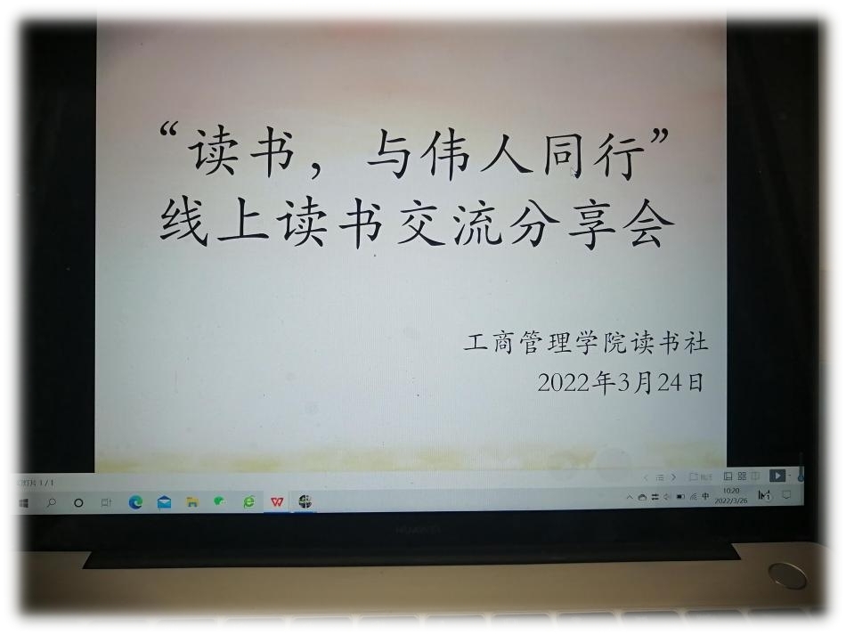 3月24日,世界杯体育官方网站读书社开展“读书,与伟人同行”的线上读书分享交流会。此次活动围绕书籍——《毛泽东阅读史》进行读书分享交流,通过学习了解伟大领袖毛主席的一生是如何选书、读书以及如何做到理论与实践相结合,从伟人身上学习终身学习的精神,更好地理解建设学习型政党和用先进的理论武装全党的必要性,从而深入学习领会习近平新时代中国特色社会主义思想。