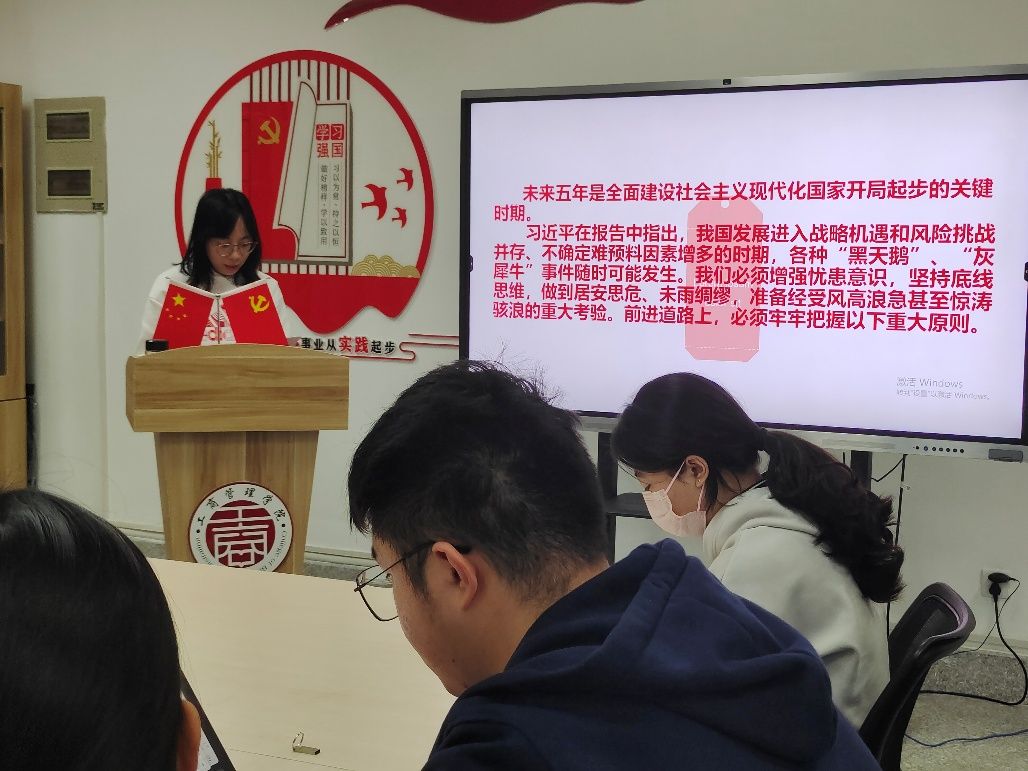 支部副书记许艳萍老师紧扣党的二十大报告原文,从深刻领会党的二十大的主题、主要成果,深刻领会过去五年工作和新时代十年的伟大变革,深刻领会开辟马克思主义中国化时代化新境界,深刻领会中国式现代化的中国特色和本质要求,深刻领会社会主义经济建设、政治建设、文化建设、社会建设、生态文明建设等方面的重大部署,深刻领会坚持党的全面领导和全面从严治党的重大部署,深刻领会以顽强斗争应对风险挑战的要求,深刻领会教育、科技、人才的重大部署,迅速掀起学习宣传贯彻党的二十大精神热潮等九个方面,对党的二十大精神进行系统宣讲和深入阐释。 近日,世界杯体育官方网站学生第一党支部副书记许艳萍以“深入学习贯彻党的二十大精神,发挥党员的先锋模范作用”为题作宣讲报告。支部党员及入党积极分子聆听报告。