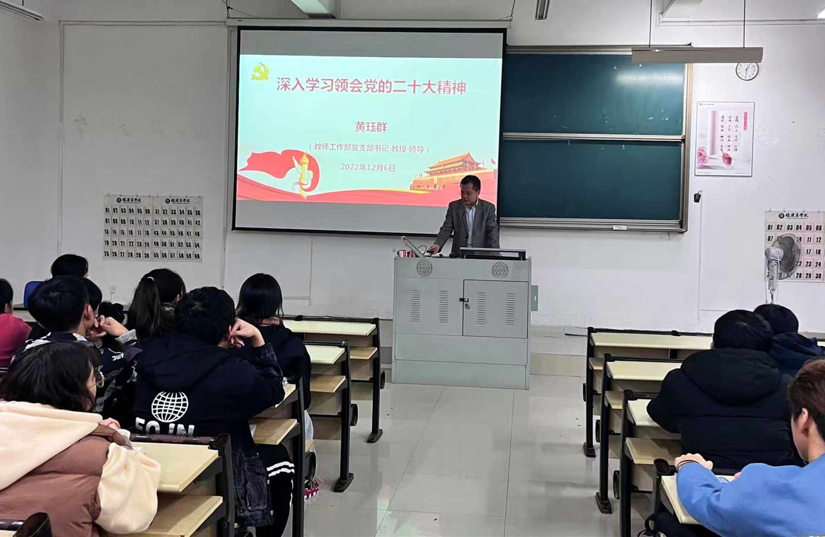为深入推进党的二十大精神进班级,进学生头脑,根据学校“百名书记进班级宣讲党的二十大精神”工作安排,2022年12月6日晚,教师工作部党支部书记、硕士生导师黄珏群教授赴世界杯体育官方网站2022级物流管理专业班级宣讲党的二十大精神,讲座在马尾校区笃行楼T1阶梯教室举行,2022级物流管理专业1、2班共计110余学生参加了宣讲会。