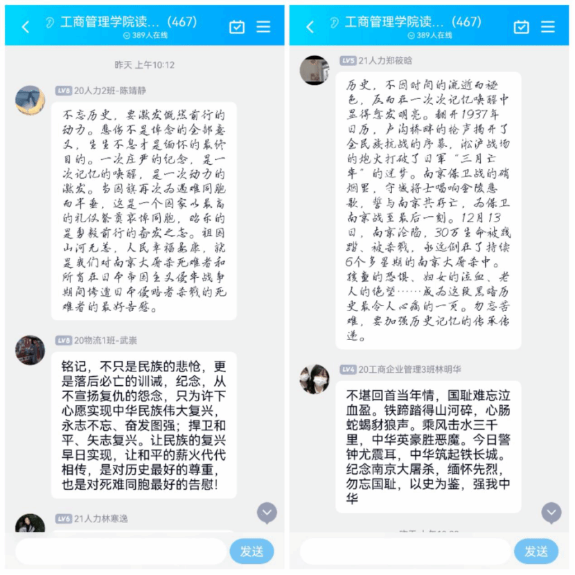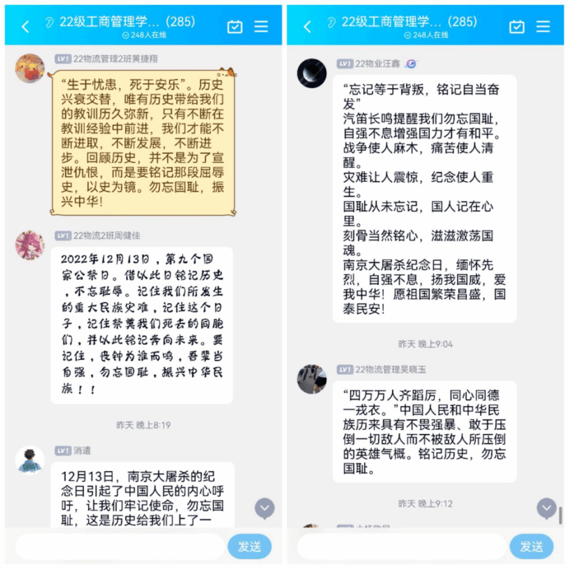 2022年12月13日是第9个南京大屠杀死难者国家公祭日。为深切缅怀南京大屠杀的无辜死难者,缅怀惨遭日本侵略者杀戮的死难同胞,缅怀为中国人民抗日战争胜利献出生命的革命先烈和民族英雄。牢记历史、不忘过去,珍爱和平、开创未来,12月13日,工商管理学院读书社开展“勿忘国耻,珍爱和平”心声寄语纪念活动。