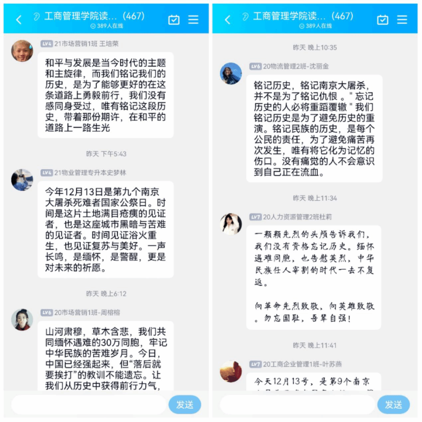 “1937年12月13日”,刻骨铭心的日期以血泪书写,记载一个民族最深重的苦难,标注人类文明史上最黑暗的一页。沉痛的历史启示我们,要时刻保持居安思危的忧患意识,铭记历史、不忘过去、珍爱和平、开创未来,矢志不渝地走和平发展的道路,共同维护“比金子还珍贵的和平时光”。在本次活动中,同学们纷纷在读书社社群里留言,以表对遇难同胞的缅怀,同时也敲响了自己心中的那个警钟以时刻警醒自己吾辈当自强,新时代新征程,要更加紧密地团结在以习近平同志为核心的党中央周围,以史为鉴、开创未来,踔厉奋发、勇毅前行,为全面建设社会主义现代化国家、全面推进中华民族伟大复兴而团结奋斗。