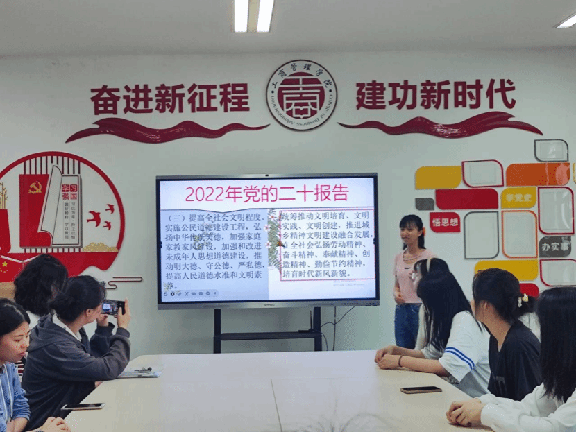 班级组织委员结合党的二十大报告内容,以理论宣讲的形式与班级同学共话读书趣事。宣讲中以小见大,从实际阅读中同学们遇到的精神内耗引出读好书的意义,并为班级同学推荐了一些书籍,最后,以宋代苏轼的“腹有诗书气自华”结尾,引导班级同学多读书,读好书,善读书,营造良好的班级读书氛围,此次活动在大家的热烈掌声中结束。