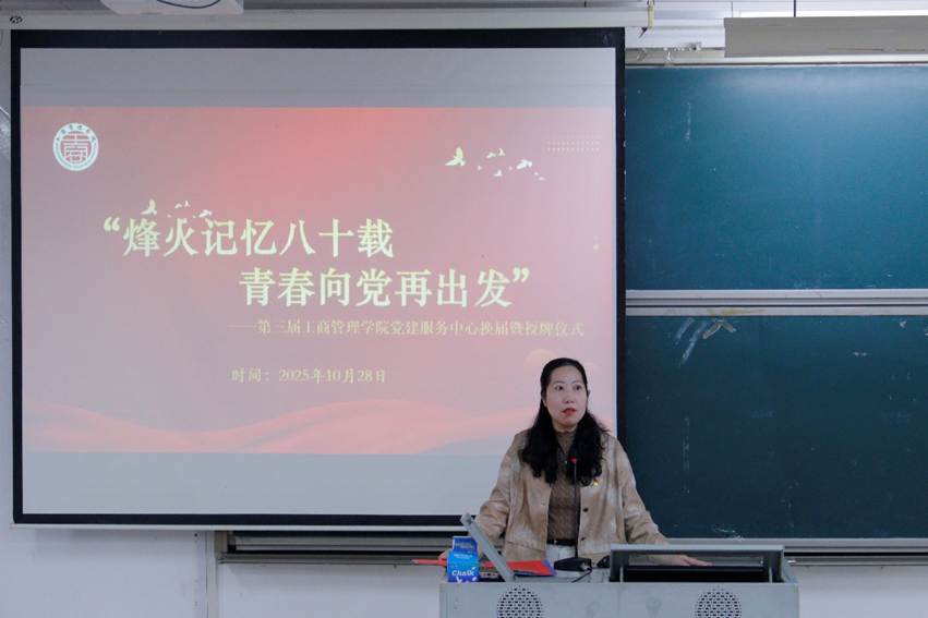 学院党委书记陈达颖发表致辞。陈书记首先对第三届党建服务团成员的辛勤付出表示肯定,回顾中心在思想引领、服务师生、组织建设等方面取得的成果。她强调新时代青年应从历史中汲取奋进力量,以“强国有我”的担当扛起党建服务责任。
