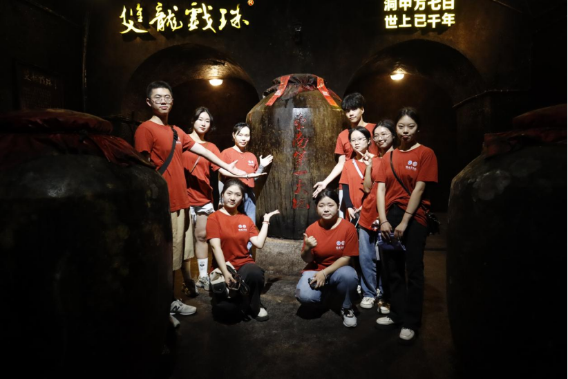 “福建产好酒,好酒出建州。”双龙戏珠酒厂拥有建瓯最大的白酒生产基地之一,实践队参观了2000平方米的生态洞藏酒区东南第一洞藏——双龙洞,洞窖岩壁以及酒陶上布满了有益于酒香的微生物群。自然储藏,恒温恒湿,一年酿造,四年洞藏。实践队沉浸式体验双龙戏珠酱酒,了解酱酒酿造工艺和酱酒文化,深深感受到建瓯在发展酒企业的同时,也重视酒文化宣传,良好的生态和悠久的历史是建瓯酒业的两张闪亮的名片,建瓯市内随处可见双龙戏珠企业广告,着力将建瓯打造成酒文化历史名城。