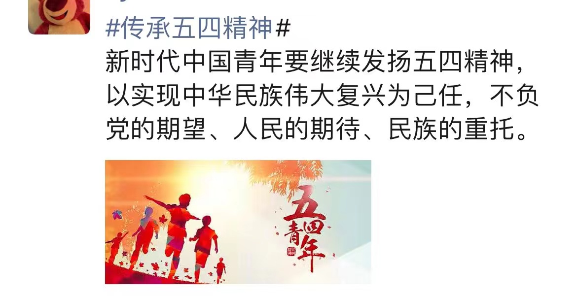 本次活动主要以专题学习和线上分享的方式进行。支部组织全体师生党员及入党积极分子学习、宣传、弘扬五四精神,回顾建团的百年奋斗征程,并围绕纪念五四、社会正能量、青春感悟等主题,在个人社交平台,以“传承五四精神”为话题,积极发言,表达对美好青春的寄语和祝福。
