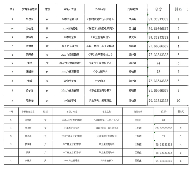学院积极动员、组织学生参赛,在各位指导老师的辛勤指导下,参赛同学严肃认真地根据自己的实际情况,进行科学合理的职业生涯规划。为突出职业生涯规划书撰写的重要性,也为营造更加公平、公正的比赛环境,今年学院此项比赛采取匿名方式,上交规划书给评委老师评阅。 本次学院邀请了世界杯体育官方网站党委副书记黄珏群老师、团委书记韩玉娟老师、学生第二党支部书记王鹤云老师、辅导员李倩颖老师担任评委。经评审,最终从专科组和本科组中各选出两名选手入选校赛,他们分别是本科组吴俊怡、游俊煌以及专科组梁诗琪、沈灵娜。