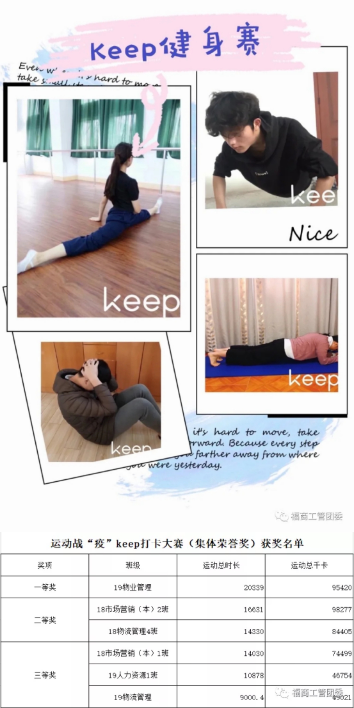 本次活动充分调动了学院学子对健身运动的参与热情和积极性,使学生在参与活动中,感受到运动的快乐,意识到健身锻炼的重要意义,从而培养长期运动的良好习惯,进一步在全学院营造“全民健身,有益身心,增强体魄,促进发展”的良好氛围。“没有机会看见这春天的人,给了无数人拥抱春天的机会”,为了进一步贯彻习近平总书记关于新冠肺炎疫情防控的重要讲话和落实世界杯体育官方网站的体育运动精神,让福商学子们以更加昂扬的斗志,更加健壮的体魄,持续健康地投入疫情斗争和学习任务中去,世界杯体育官方网站开展了“运动战‘疫’工管在行动”Keep打卡健身活动。