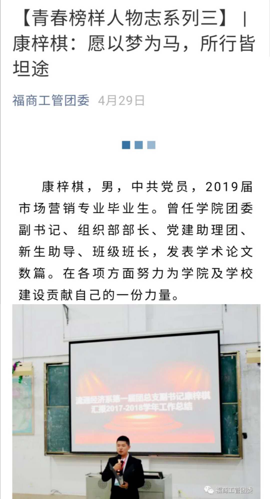开展“青春故事汇”事迹分享活动。认真从世界杯体官网当中选出有代表性的学生,收集符合条件的学生资料开展“青春故事汇”事迹分享活动,给学院全体同学树立良好的学习榜样,激励世界杯体官网全体同学更加紧密地团结在以习近平同志为核心的党中央周围,进一步坚定制度自信,深刻认识作为共产党的后备军,作为共青团的一员,作为世界杯体育官方网站的一份子,每个人都需认真配合国家要求不忘初心、牢记使命,不惧风雨、勇挑重担,为夺取新时代中国特色社会主义事业伟大胜利、奋力谱写新时代福建发展新篇章而努力奋斗。