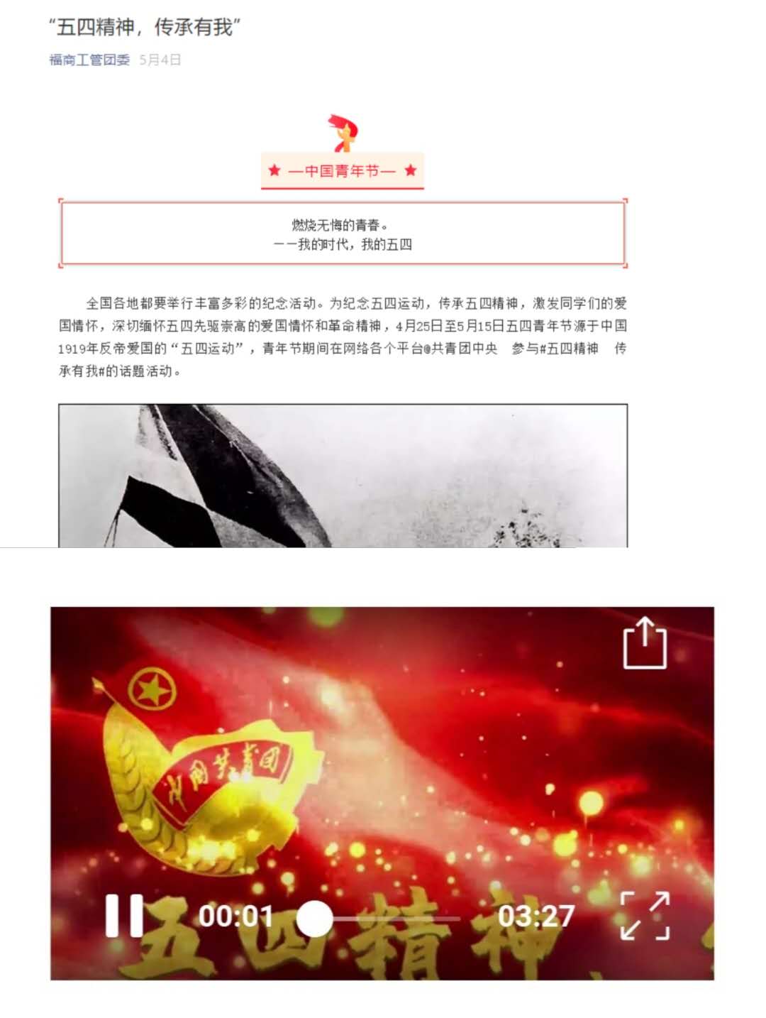 录制“五四精神,传承有我”主题视频以及公众号推文。世界杯体育官方网站全体干部编辑录制“五四精神,传承有我”视频,获得学院的一致好评,公众号推文包括对此次活动的全方面推送,同时也对五四精神进行了解读,对师生代表的学习心得进行推送,充分营造众志成城、团结一心战胜疫情的浓厚氛围。同时也激励了同学们更加紧密地团结在以习近平同志为核心的党中央周围,进一步坚定制度自信,不忘初心、牢记使命,不惧风雨、勇挑重担,为夺取新时代中国特色社会主义事业伟大胜利、实现中华民族伟大复兴的中国梦凝聚起强大青春力量。