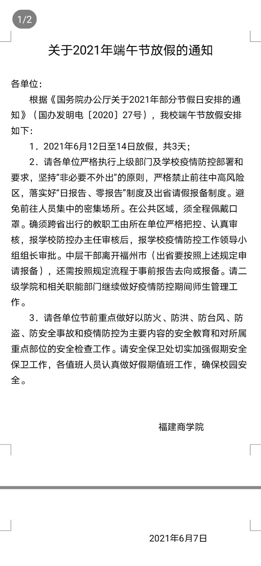 关于2021年端午节放假的通知