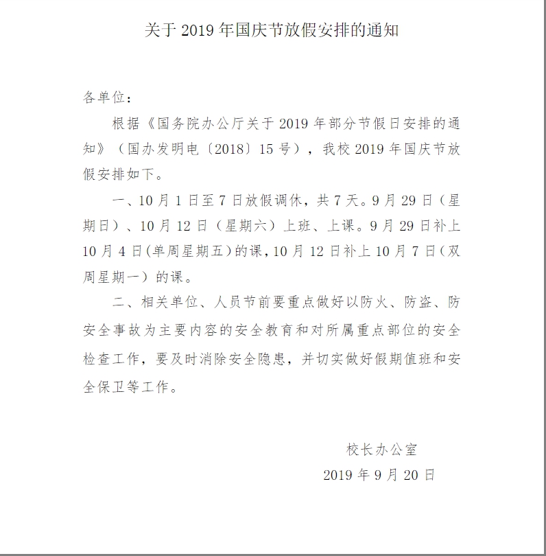 关于2019年国庆节放假安排的通知