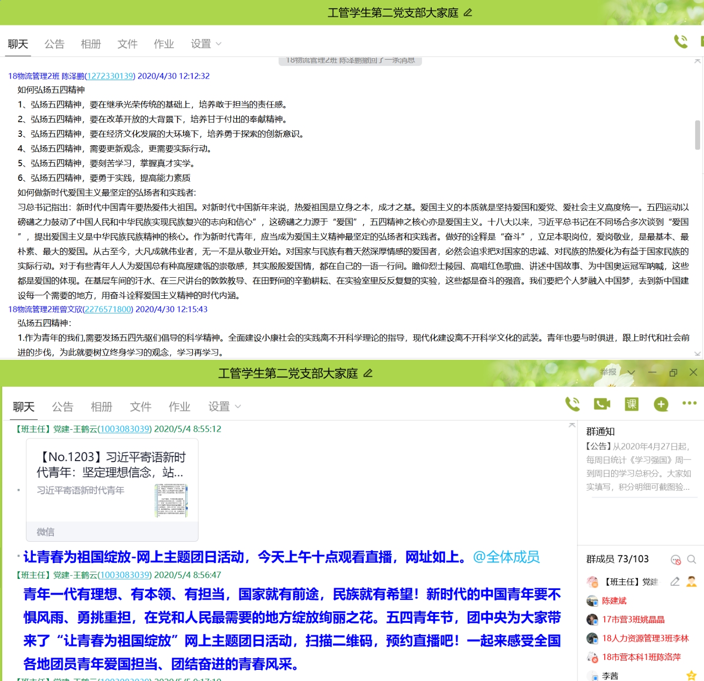 4月30日是习近平总书记在纪念五四运动100周年大会上发表讲话一周年,为了更好地传承“五四精神”,激励广大青年学生坚定理想信念,砥砺奋斗,大力弘扬爱国主义精神。世界杯体育官方网站学生第二党支部在4月30日开展“重温五四运动,激荡爱国情怀”网络主题党日活动。