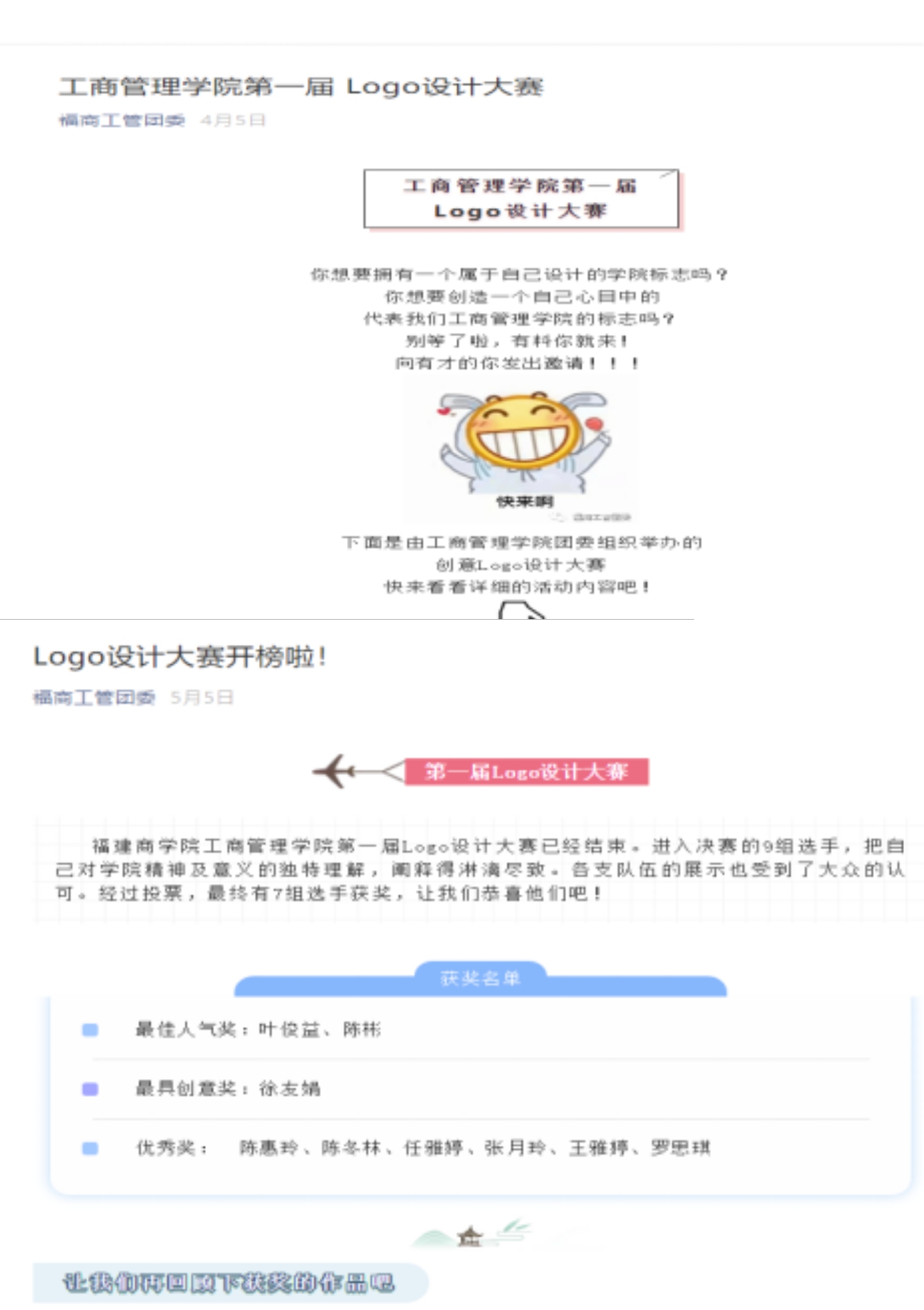 世界杯体官网学子积极参赛,精心设计,充分利用色彩、阴影、文字等多样化现代化的元素,融合对学院精神、青年力量的理解和诠释,充满了朝气蓬勃的奋进气息。经过初赛筛选、微信公众号投票以及线上LOGO展示,18物流管理徐友娟同学的作品荣获最具创意作品奖,叶俊益、陈彬同学的作品荣获最佳人气奖,陈惠玲、陈冬林、任雅婷和张月玲、王雅婷、罗思琪等同学的作品荣获优秀奖。