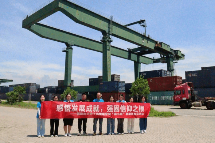 (7月5日上午,实践队员们在铁路物流园区“闽都号”中欧班列龙门吊起重机作业区与园区工作人员合影。金婷 摄)