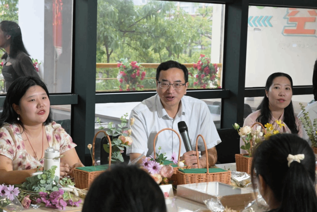 在作品展示与分享环节,校党委副书记蒲文庆对学生制作的精美花艺作品赞不绝口,鼓励同学们以当下最美情绪积极应对日常生活中的困难和压力,通过恰当的方式,如园艺活动,调节情绪,积蓄能量。期望以美养心育人,帮助同学们心理成长,健康成才。
