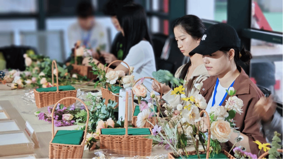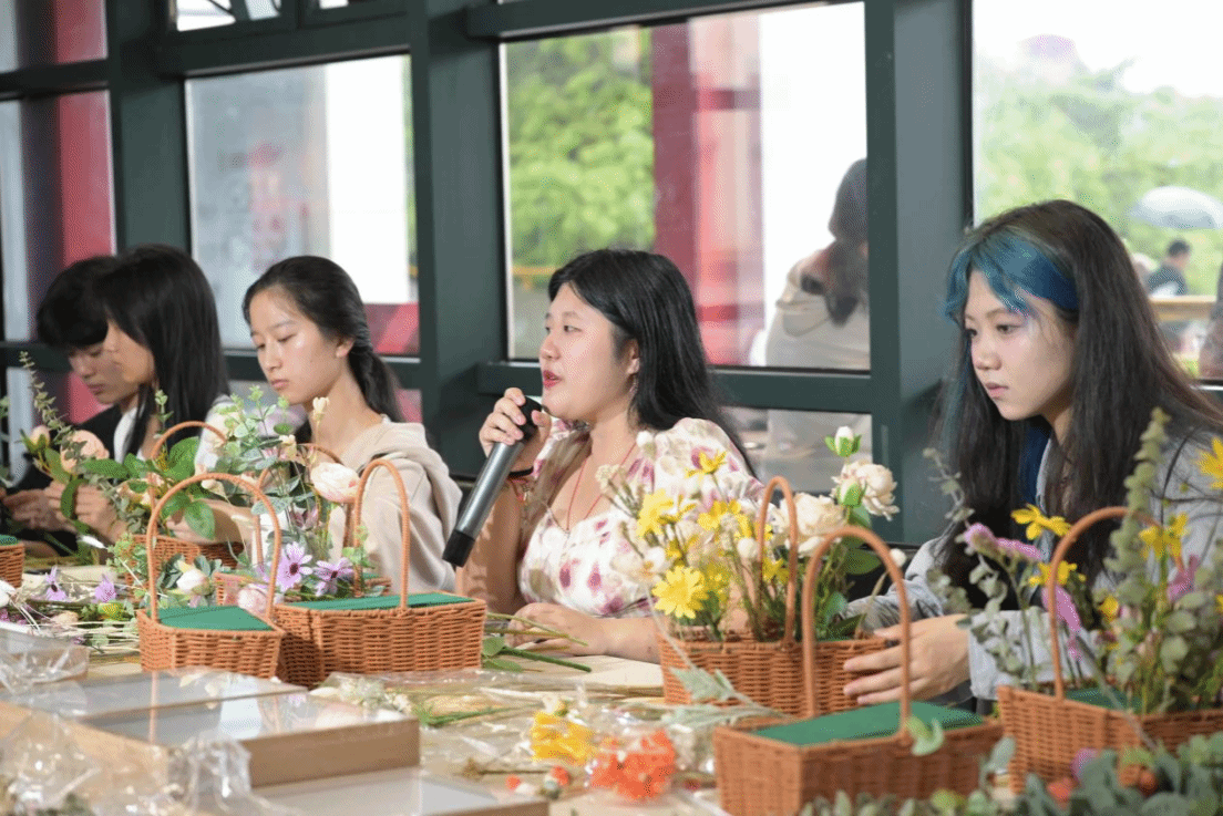 活动中,举办了园艺心理疗法知识讲座,并现场传授了插花、植物拓染和干花装饰画制作的工艺技巧。同学们倾听心灵的回音,走进艺术的花园,发现生活的美好。现场气氛热烈,同学们纷纷动手实践,亲手设计制作造型各异,趣味盎然的花艺作品,既有清新淡雅的色调,也有热烈奔放的色彩,深刻体会着花艺带来的愉悦和满足,并相互讨论创作理念和心得。